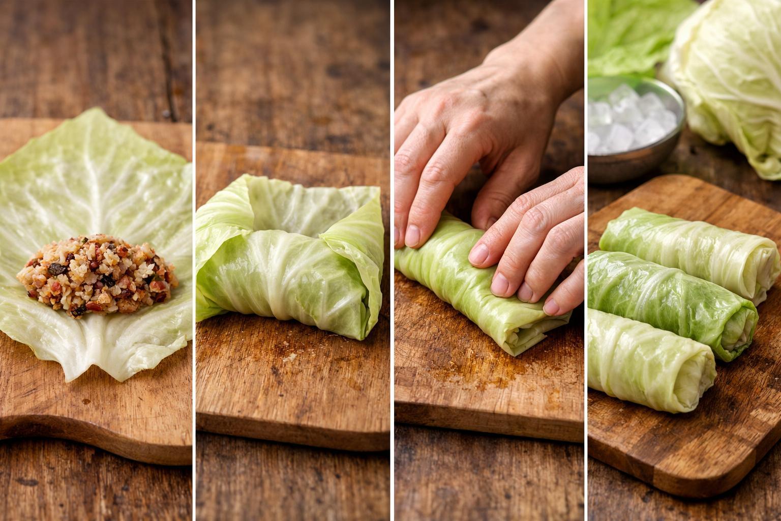 Правильно заворачивать голубцы значит держать форму плотной, а швы надежными. Во-первых, я кладу начинку ближе к основанию листа. Во-вторых, прячу края и уверенно скатываю к верхушке.