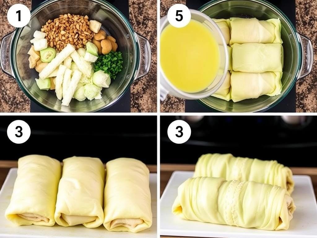 Прежде всего, положите столовую ложку начинки на лист. Подверните низ, затем боковые стороны. Во-первых, сверните рулет до конца. Если лист тонкий, используйте двойной слой. Это добавит прочности и сочности.