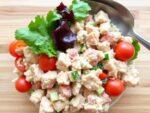 Салат с тунцом Ольга Сеонова, где акцент делается на авторскую заправку. Прежде всего, заправка может включать йогурт, дижонскую горчицу и немного лимонной цедры.