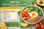 🍽️ Почему это полезно · Гречка — источник сложных углеводов и клетчатки, долго даёт сытость и поддерживает энергию. · Авокадо содержит полезные мононенасыщенные жиры, которые поддерживают здоровье сердца. · Яйцо обеспечивает качественный белок и витамины. · Овощи и зелень добавляют антиоксиданты, минералы и микроэлементы.