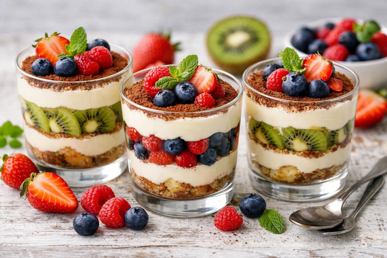 Тирамису в стакане с фруктами — свежий и лёгкий вариант. Прежде всего, добавьте слой ягод или ломтики киви для контраста. Более того, фрукты освежают и делают десерт ярким на фото.